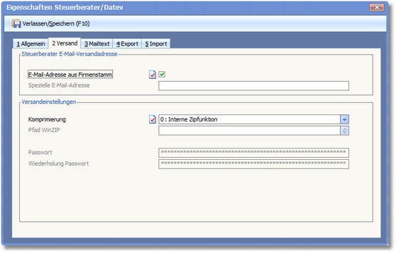<< Hier KLicken um eine Inhaltsübersicht anzuzeigen >> Navigation: Finanzbuchhaltung > Stammdaten > Basisdaten > Datevcenter > Die Karteikarte "Versand" |