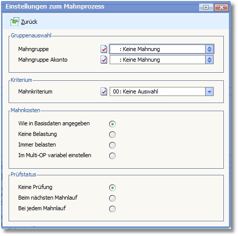 Adressen können mit einem Prüfkennzeichen im Mahnvorschlag versehen werden. Dazu stehen Ihnen in diesem Bereich folgende Optionen zur Verfügung: