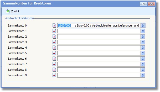 Über den Menüpunkt "Bearbeiten > Sammelkonten für Kreditoren" in den Basisdaten werden die Sammelkonten für Verbindlichkeiten festgelegt. Es können 10 Sammelkonten eingetragen werden, auf welche die Salden der Kreditoren für das Hauptbuch kumuliert werden.