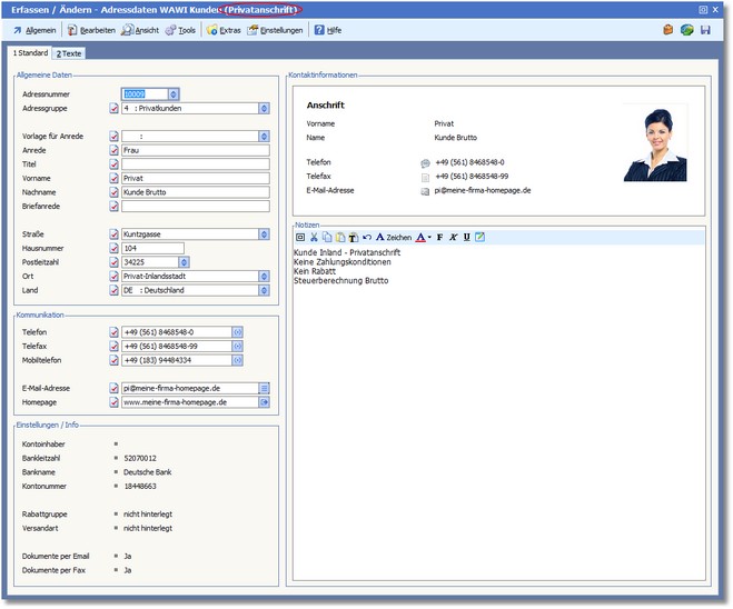 In diesem Bereich werden Bankverbindung, Zahlungskonditionen, Lieferbedingung und Steuerberechnung der Adresse angezeigt.