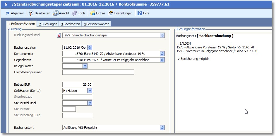 Die Vorsteuerabgrenzung kann auch über den Menüpunkt "Tools > Buchung erstellen > Vorsteuerabgrenzung Folgejahr" erreicht werden.