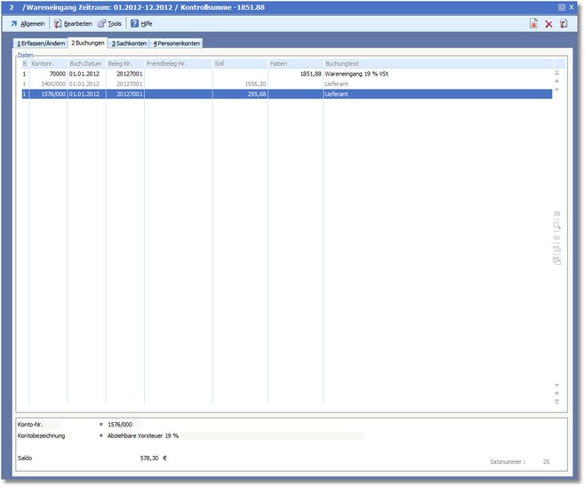 In der Buchungsübersicht wird jede Buchung einzeilig dargestellt. Die Gliederung in Haupt- und Nebensatz wird hier nicht vorgenommen. |