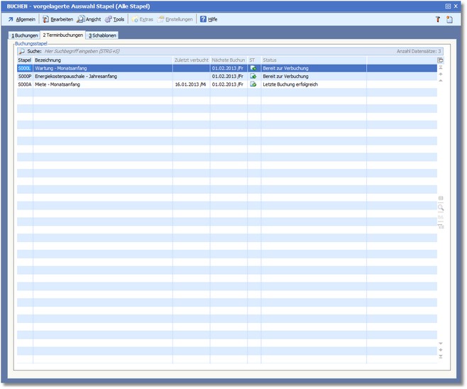Wurde die Verbuchung durchgeführt, erscheint der Hinweis "Fällige Terminbuchungen" nicht mehr in der Stapelauswahl und die Terminbuchung erhält den Status "Letzte Verbuchung erfolgreich".