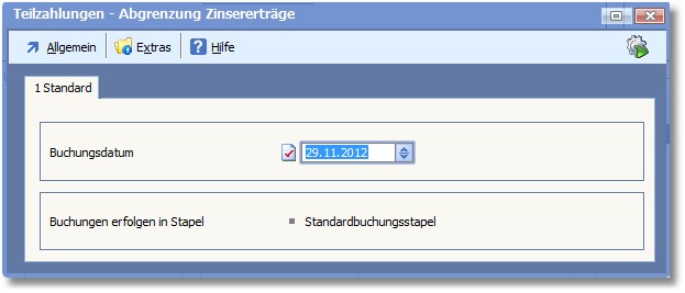 | 1. | Wählen Sie in der Buchungsmaske den Menüpunkt "Tools > Buchungen erstellen > Abgrenzung Zinserträge aus Teilzahlungen". |