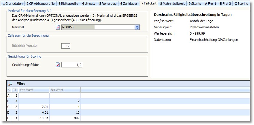 Mahnhäufigkeit oder die Überschreitung der Fälligkeit. Deshalb kann über einen Faktor bestimmt werden, ob und wie stark eine Einzelanalyse in die Bonitätseinstufung einfließen soll.