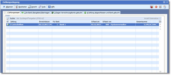 << Hier KLicken um eine Inhaltsübersicht anzuzeigen >> Navigation: Finanzbuchhaltung > Zahlungsverkehr > Zahlungseingang > Die Karteikarte "Zahlungsstapel" |