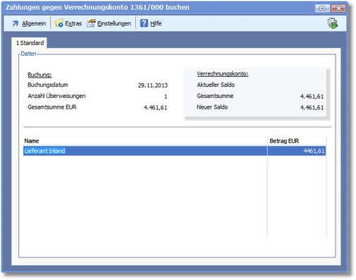 << Hier KLicken um eine Inhaltsübersicht anzuzeigen >> Navigation: Finanzbuchhaltung > Zahlungsverkehr > Zahlungsausgang > Die Karteikarte "An Bank übergeben/übertragen" > Zahlungen gegen Verrechnungskonto buchen |