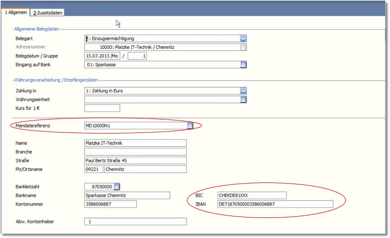 Wenn Sie die Position öffnen, können Sie die Mandatsreferenz und die Kontoangaben nochmals überprüfen.