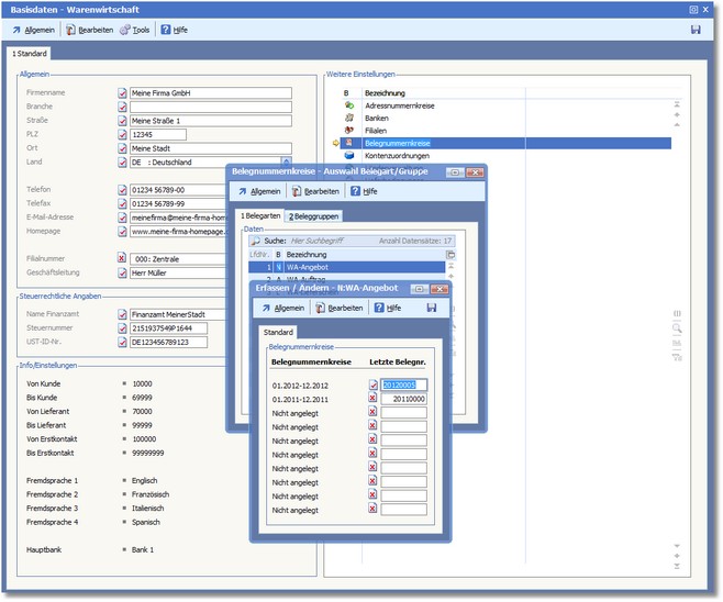 Neue Belegnummern können in der Warenwirtschaft im Firmenstamm, oder ab der Version 5.41 in dem Menü Belegzeiträume verwaltet werden.