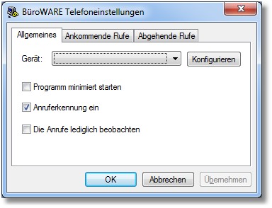 Einzustellen ist hier unbedingt das Gerät, über das telefoniert werden soll. In der Regel wählen Sie hier den TAPI-Treiber des Herstellers aus. Möglich ist hier nicht nur der TAPI-Treiber eines TAPI-Telefons, sondern auch TAPI-Treiber für CAPI, so dass ohne Telefon auch mit der ISDN-Karte telefoniert werden kann (Soundkarte, Lautsprecher, Mikrofon).