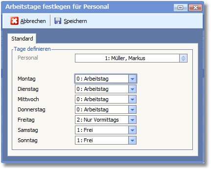 Hier werden generelle und arbeitsfreie Tage für den ausgewählten Mitarbeiter festgelegt.
