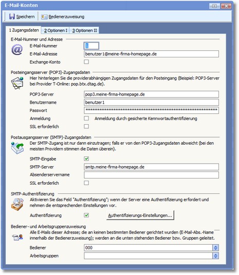 Damit die Benutzer E-Mails versenden und empfangen können, müssen die E-Mail-Stammdaten angelegt werden. In den E-Mail-Konten geben Sie die in Ihrem Unternehmen verwendeten E-Mail-Adressen, die dazugehörigen SMPT- und Pop3-Server mit den entsprechenden Passwörtern und Parametern ein.