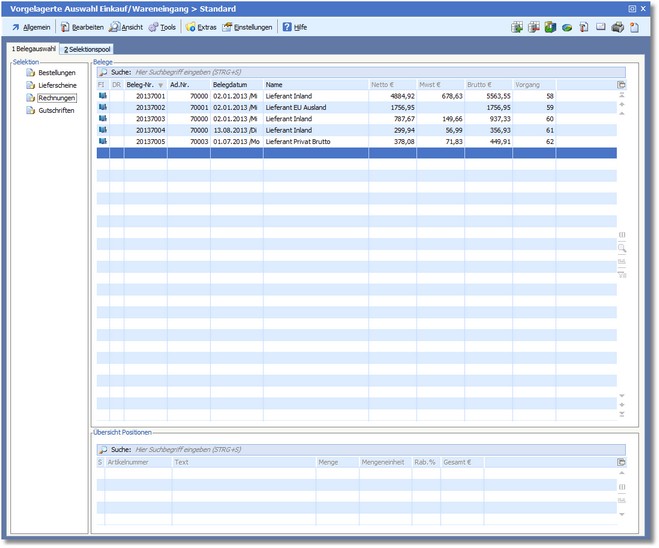 Das Programm öffnet die Belegtabelle für den Wareneingang.
