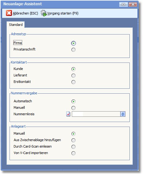 Im Neuanlageassistenten werden zunächst allgemeine Parameter für die Adresse festgelegt: