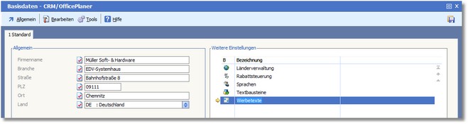 Die Basisdaten - CRM/OfficePlaner werden geöffnet.