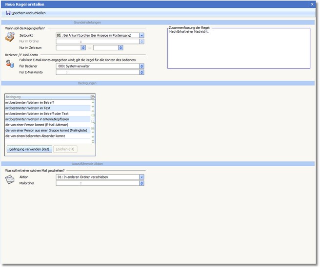<< Hier KLicken um eine Inhaltsübersicht anzuzeigen >> Navigation: OfficePlaner > Mailsystem > Mail einrichten > E-Mail-Assistent - Extras > Regelassistent > Neue Regel erstellen > Der Dialog "Neue Regel erstellen" |