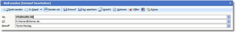 Tragen Sie hier die E-Mail-Adresse des Empfängers der E-Mail-Nachricht ein. Soll die E-Mail mehrere Empfänger erreichen, werden die E-Mailadressen aller Empfänger durch Semikolon (;) getrennt eingegeben.