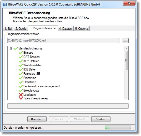 Auf dieser Karteikarte können nun die einzelnen Programmbereiche, welche gesichert werden sollen, durch Anklicken ausgewählt werden.