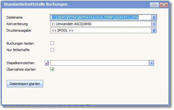 In diesem Feld ist der Pfad für die Importdatei einzutragen. Die Funktionstaste [F5] öffnet hier den Dateiauswahldialog.