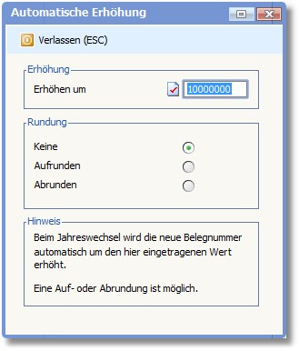 Hier werden die Parameter zur automatischen Erhöhung der Belegnummern festgelegt: