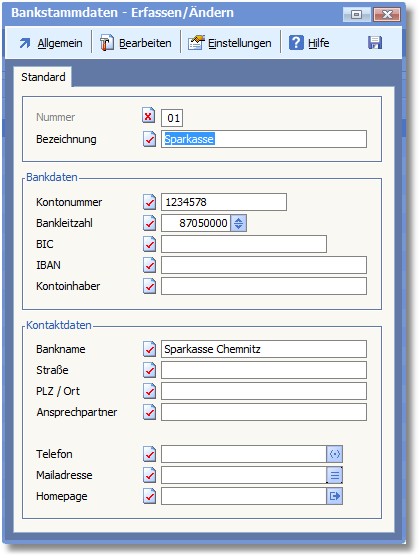Der Bearbeitungsdialog der Bankstammdaten enthält folgende Felder:
