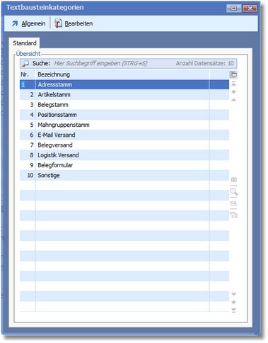 Die Auswahltabelle der Textbausteinkategorien wird geöffnet.