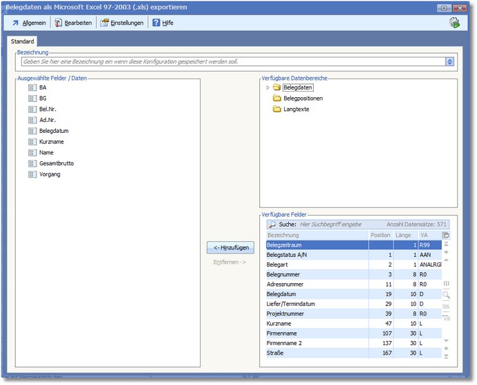 In dieser Maske können Sie die zu exportierenden Daten nach Ihren Bedürfnissen zusammenstellen, diese Einstellungen speichern und gespeicherte Konfigurationen bei Bedarf wieder aufrufen.