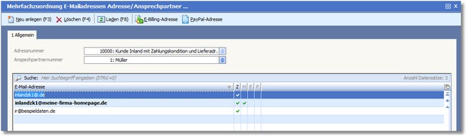 Wenn ein Ansprechpartner über mehrere Mailadressen verfügt, können Sie ihm hier weitere zuordnen.