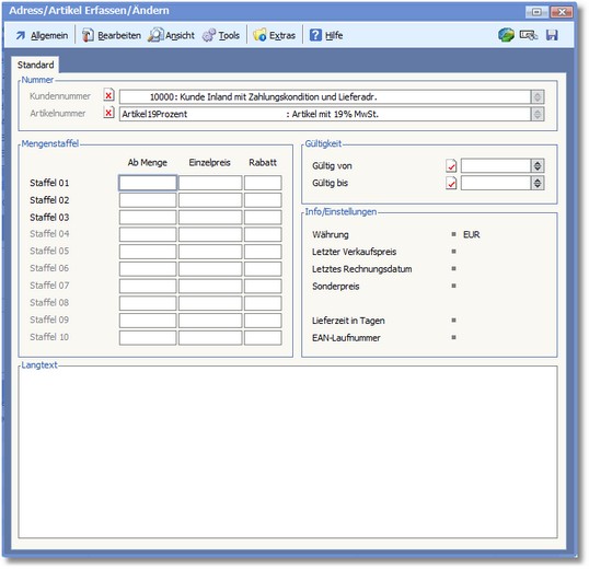 6. Erfassen Sie die Daten in den vorgesehenen Feldern und speichern Sie die neue Adress/Artikel-Kondition mit der Funktionstaste [F10].