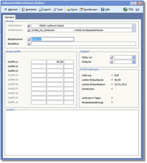Langtext verwenden Aktivieren Sie diese Option, wenn Sie den Artikel-Langtext in die Positionsnotiz einer neu erfassten Position übernehmen und drucken wollen.