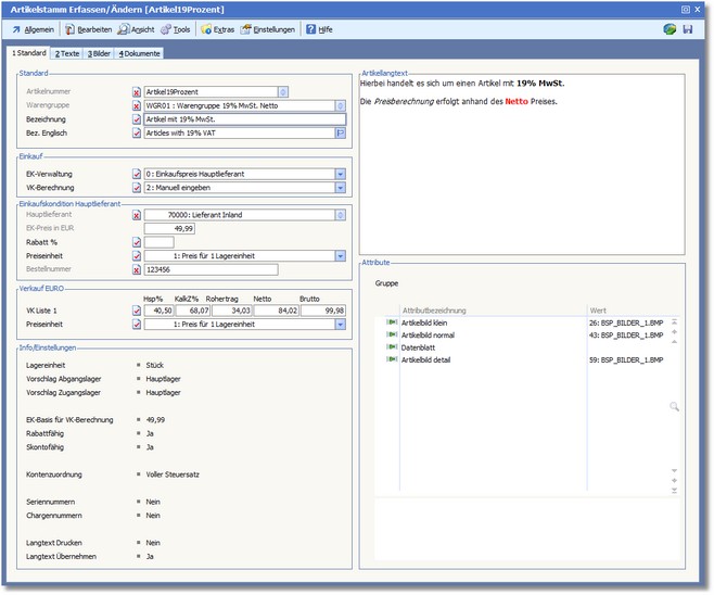 In dieser Karteikarte werden allgemeine Parameter für den Artikel hinterlegt.