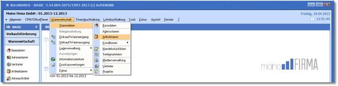 1. Klicken Sie mit der Maus auf im Hauptmenü auf "Warenwirtschaft / Stammdaten / Artikelstamm".