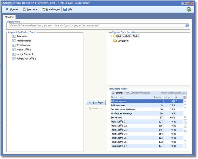 << Hier KLicken um eine Inhaltsübersicht anzuzeigen >> Navigation: Warenwirtschaft > Stammdaten > Konditionen > Adress/Artikel > Selektionspool Adress/Artikel > Exportieren |