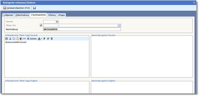 4. In der Karteikarte "Suchmaschinen" können Sie Schlüsselwörter in Deutsch und in Englisch hinterlegen: