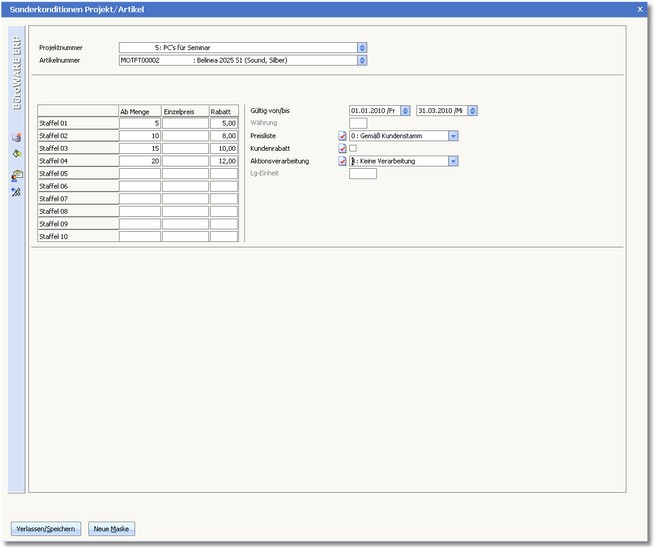 Das Programm öffnet den Dialog "Sonderkonditionen Projekt/Artikel".