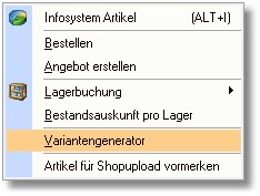 4. Wählen Sie in der Artikelbearbeitung den Menüeintrag "Tools > Variantengenerator".