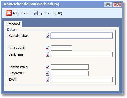 In dieser Maske sind ggf. die Daten einer abweichenden Bankverbindung für diesen Beleg anzugeben.