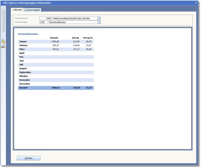 Mit "Analyse" für Adress/Artikel stehen Ihnen Umsatz- und Ertragsdaten des aktuellen Jahres zur Verfügung.