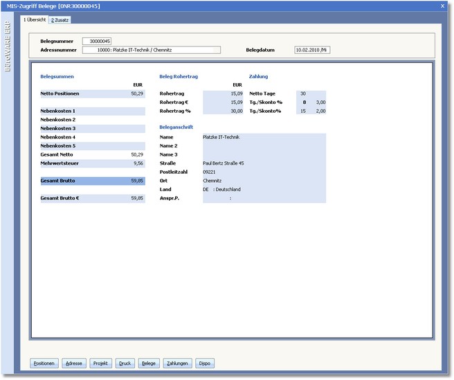 Die Informationskarteien des MIS-Belege stellen Ihnen im Wesentlichen die Belegdaten der Belegseite 1-2 zur Verfügung.
