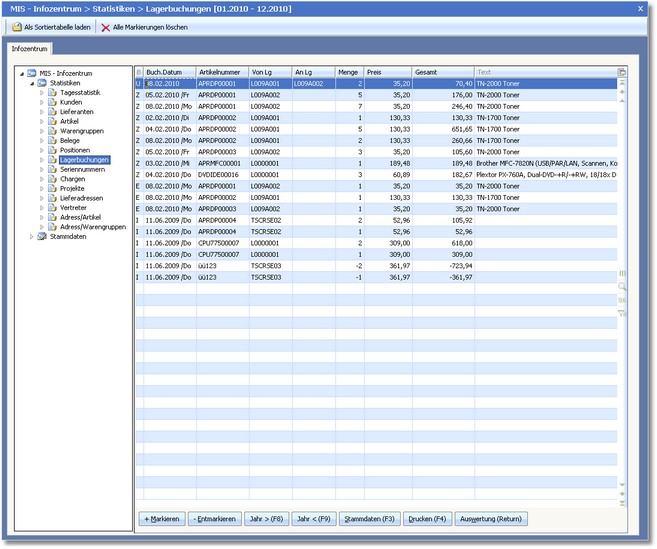 Nach Auswahl des MIS-Bereiches öffnet sich zunächst eine vorgelagerte Auswahltabelle, in der alle Lagerbewegungen (Positionen) tabellarisch angezeigt werden. Über die Baumauswahl kann in die einzelnen Lagerbewegungsarten (Zugang, Abgang, Umbuchung und Inventur) verzweigt werden. Innerhalb dieser Auswahltabelle sind die beschriebenen Such- und Sortierfunktionen aktiv.