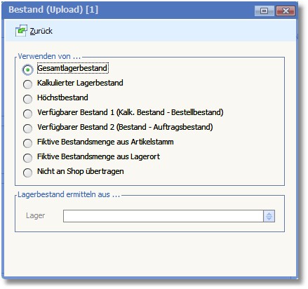 Hier wird durch Aktivierung der entsprechenden Option festgelegt, welche Menge in den Shop als "Bestand" übertragen wird: