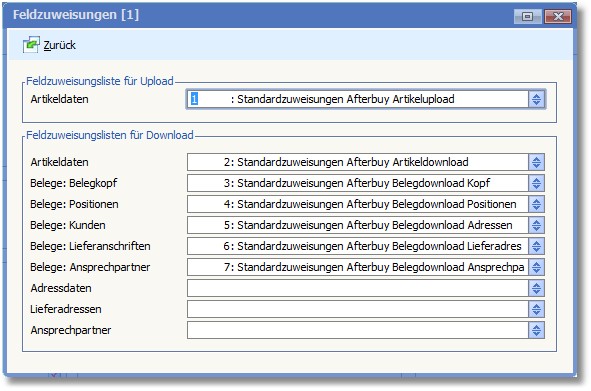 << Hier KLicken um eine Inhaltsübersicht anzuzeigen >> Navigation: Warenwirtschaft > Extras > Shopmanager > Marketplaces > Afterbuy > Marketplace verwalten > Einstellungen > Feldzuweisungen |