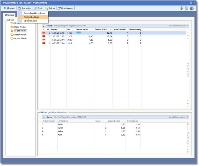 Kassenberichte einlesen Öffnet den Dialog zur Berichtserstellung.